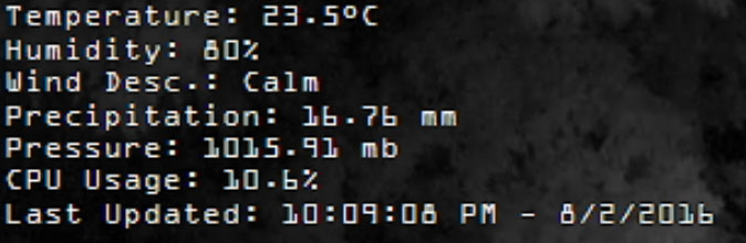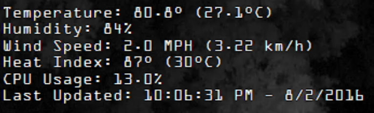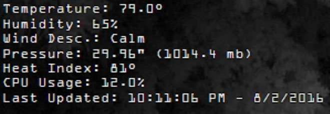 Here are a few examples of the weather on your video feeds. You can select which conditions to show, what units to display and more.