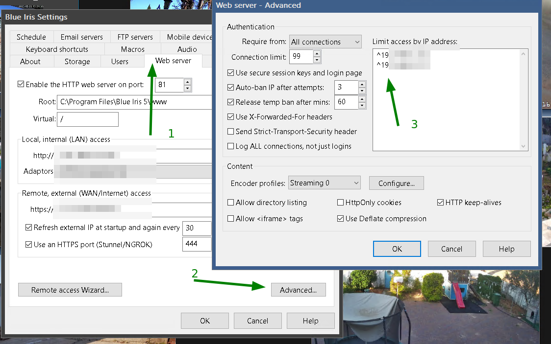 1. You want to avoid using using an entry like ^192.168.1.* in Blue Iris Settings > 'Web server' > Advanced > 'Limit access by IP address'.