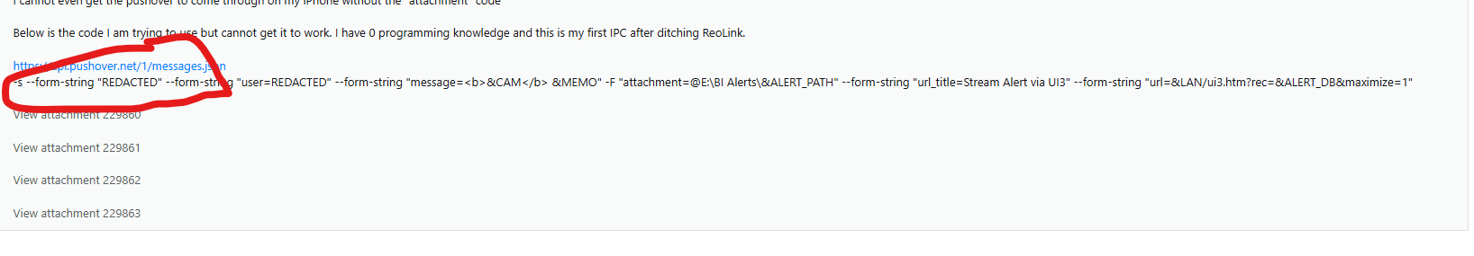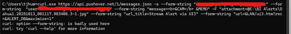 Code:https://api.pushover.net/1/messages.json -s --form-string "token=%996" --form-string "user=%997" --form-string "message=<b>&CAM</b> &MEMO" -F "attachment=@C:\BlueIris\Alerts\&ALERT_PATH" --form-string "device=iphone1,iphone2"